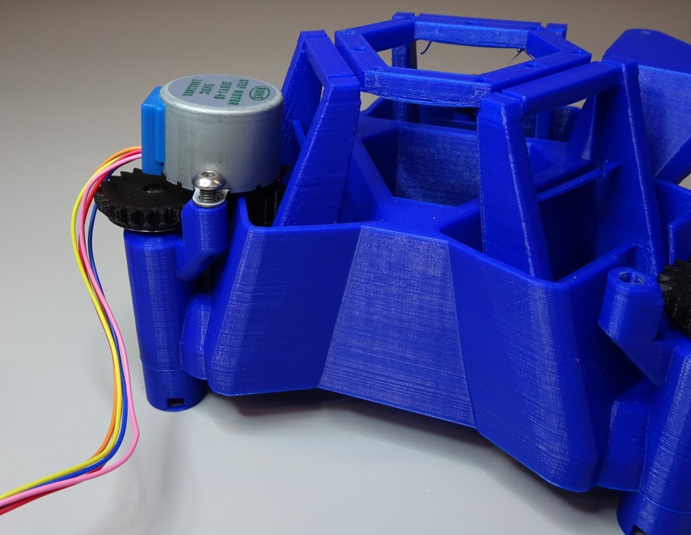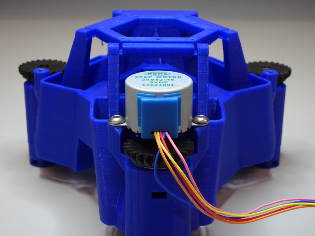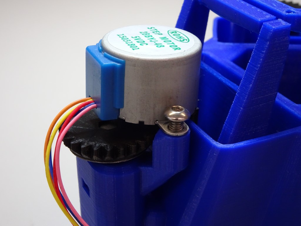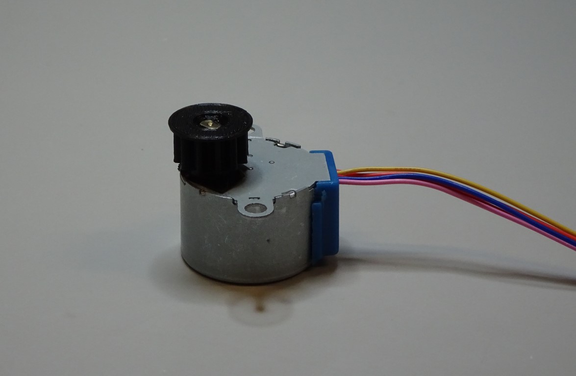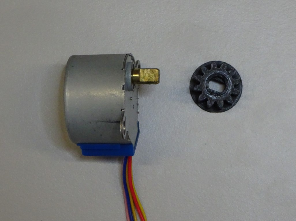 Put the small gear with its circular side down. Put one 28BYJ-48 micro geared stepper motor through the hole of the gear. The hole isn't circular so the motor shaft will need to be lined up correctly.