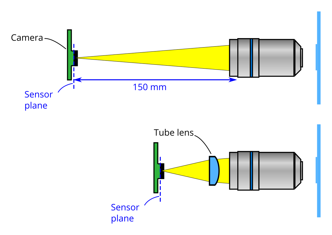 Using a tube lens also allows us to use an infinite conjugate objective, however we need a different separation between the lens and the sensor plane. Light exiting an infinite conjugate objective is collimated (or is said to form an image at infinity). As such, a tube lens is always needed to form an image inside a microscope if an infinite conjugate objective.