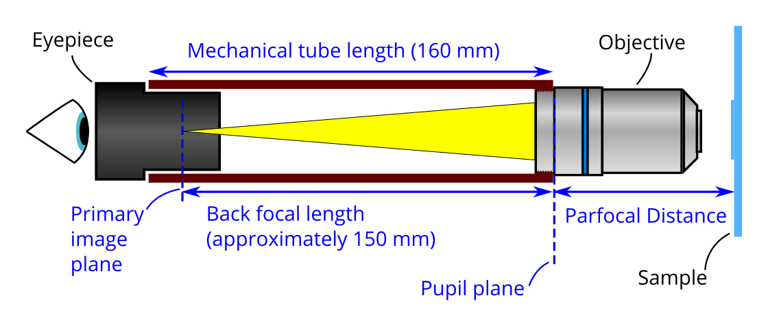 In its most basic form the imaging components of an analogue microscope consists of an objective and an eyepiece attached to a tube. Objectives are designed for a tube of a given length (the mechanical tube length or tube length), and to be a specific distance from the sample (parfocal distance). Both of these measurements are specified from the end of the tube the objective is screwed into. A shoulder on the objective sets where the objective meets the end of this tube.